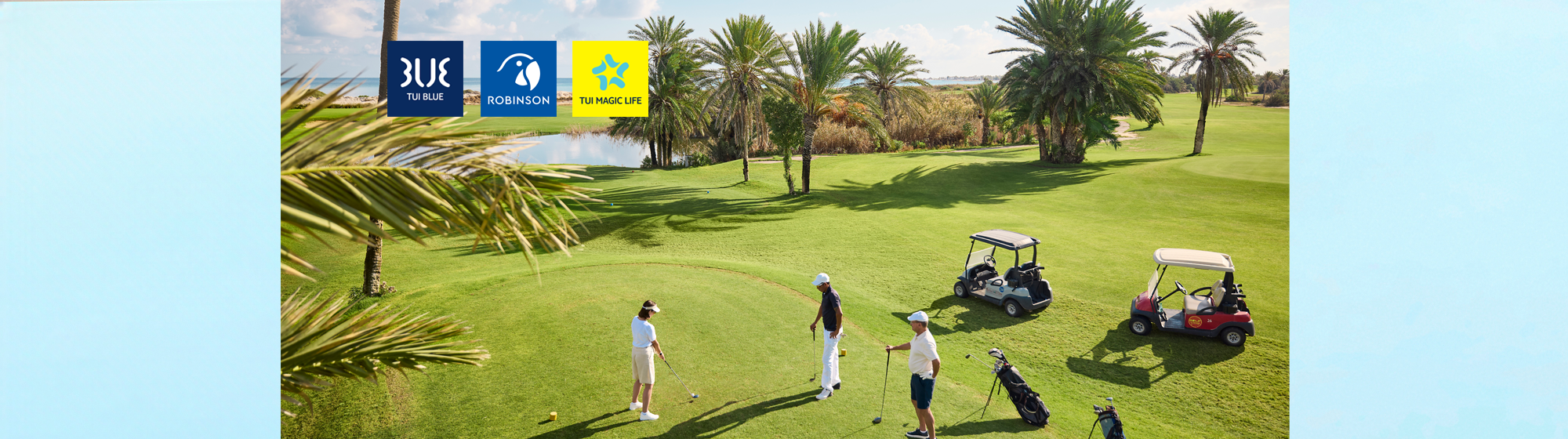Wenn sich im Frühling die Fairways in frischem Grün zeigen und im Herbst milde Temperaturen beste Bedingungen bieten, ist die ideale Zeit für unvergessliche Golferlebnisse. Eine morgendliche Partie Golf und danach am Strand entspannen oder einen Drink an der Bar genießen? In unseren TUI BLUE Hotels und ROBINSON sowie TUI MAGIC LIFE Clubs ist beides möglich. Hier können Sie Sport, Komfort und Erholung kombinieren. Ob Handicap verbessern oder einfach abschalten – erleben Sie Ihre schönsten Golfmomente ganz in der Nähe in Deutschland und Österreich oder an den beliebtesten Küsten von Spanien, Portugal, Marokko und der Türkei.